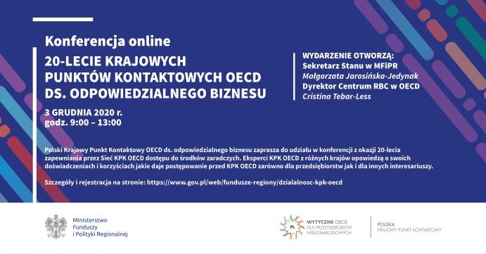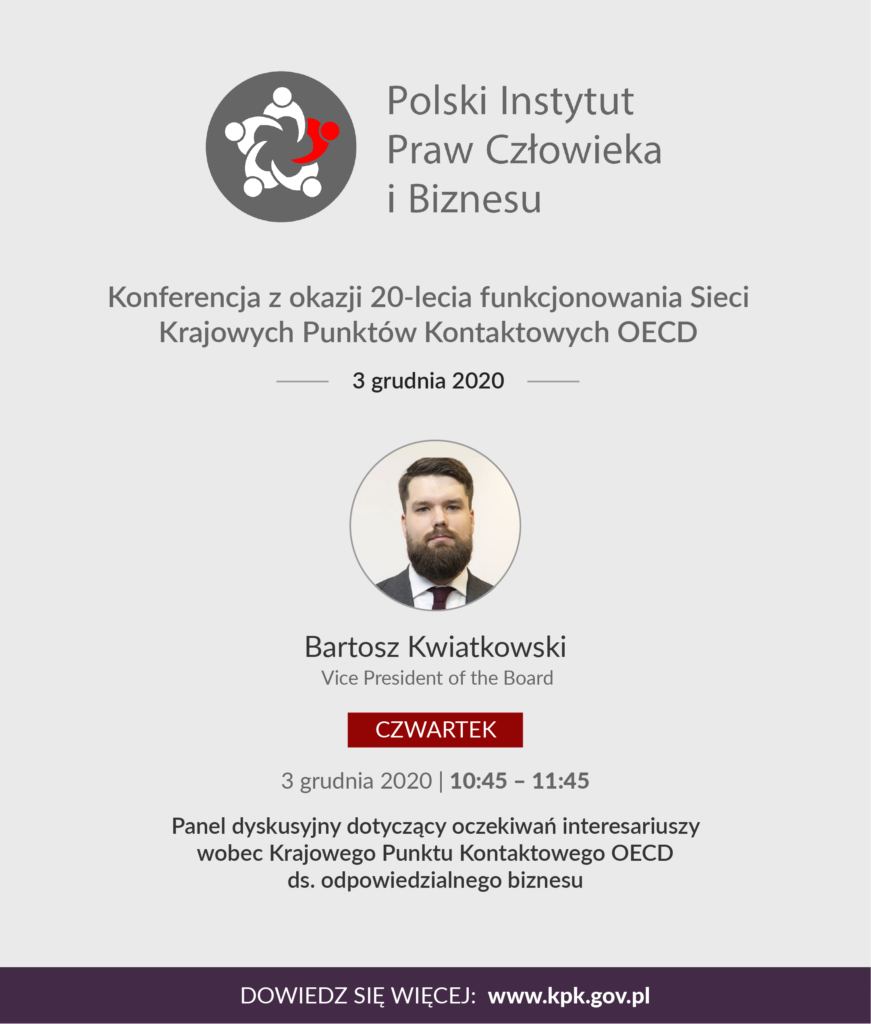 Z przyjemnością informujemy, że wiceprezes PIHRB, Bartosz Kwiatkowski będzie reprezentował PIHRB – jako organizację członkowską OECD Watch podczas konferencji organizowanej przez Polski Krajowy Punkt Kontaktowy OECD ds. odpowiedzialnego biznesu 3 grudnia 2020 r. w godz. 9.00 – 13.00 z okazji 20-lecia zapewniania przez Sieć KPK OECD dostępu do środków zaradczych. Bartosz Kwiatkowski będzie uczestniczył w drugim panelu dyskusyjnym dedykowanym oczekiwaniom interesariuszy wobec KPK OECD w Polsce i poza nią.